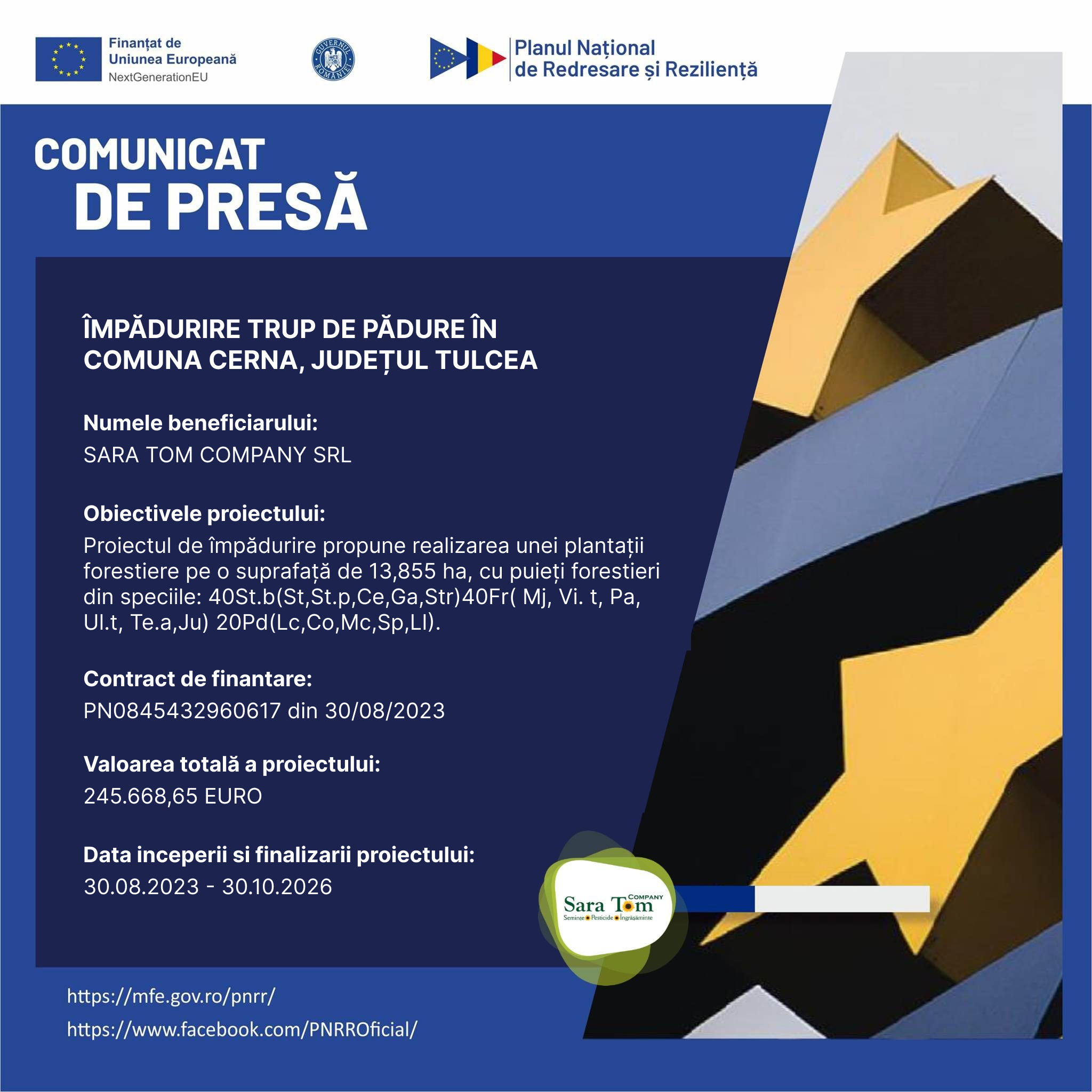 Incepand cu luna mai anul curent, am demarat lucrările la linia de productie brichete din biomasa produsă in propria fermă vegetală, situata in comuna Cerna, satul Traian, județul Tulcea. Investiția este realizată prin accesarea unei scheme de ajutor de minimis in vederea tranzitiei catre economia circulara cu sprijinul Ministerului Economiei in cadrul proiectului “Dotarea companiei Sara Tom Company cu echipamente de productie si ambalare brichete din rumegus sau resturi vegetale in vederea facilitarii tranzitiei catre economia circulara a activitatii sale” Linia de brichetare va fi functionala pana la finalul lunii noiembrie 2023 si are ca scop întregirea portofoliului de produse și servicii sustenabile, oferite partenerilor nostri. Pentru detalii contactati-ne pe adresa de mail office@saratomcompany.ro sau accesând pagina noastră de facebook